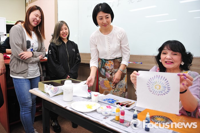 (서울=포커스뉴스) 지난 16일 오후 서울 광진구 능동로 건국대학교 사범대학 일본어교육과에서 열린‘일본 전통 염색의 이해와 체험' 특강에서 일본 돗토리현(鳥取縣)의 전통 공예사 가와하라 가나요(오른쪽, 川原かなよ)씨가 돗토리현의 향토 공예품인 '다이센 유젠조메(大山友禅染)'를 학생들에게 선보이고 있다. 건국대 사범대학 일어교육과와 교육대학원 일어교육전공 학생지원 프로그램인 ‘일본 문화의 이해와 체험’의 5번째 행사로 진행된 이번 강연에서 학생들은 일본의 전통 염색법인 유젠조메(友禅染)를 기반으로 일본 돗토리현의 향토색이 더해진 '다이센(大山) 유젠조메'를 직접 체험했다고 설명했다.