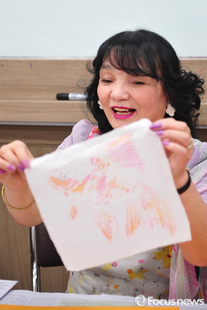 (서울=포커스뉴스) 지난 16일 오후 서울 광진구 능동로 건국대학교 사범대학 일본어교육과에서 열린‘일본 전통 염색의 이해와 체험' 특강에서 일본 돗토리현(鳥取縣)의 전통 공예사 가와하라 가나요(川原かなよ)씨가 돗토리현의 향토 공예품인 '다이센 유젠조메(大山友禅染)'를 학생들에게 선보이고 있다. 건국대 사범대학 일어교육과와 교육대학원 일어교육전공 학생지원 프로그램인 ‘일본 문화의 이해와 체험’의 5번째 행사로 진행된 이번 강연에서 학생들은 일본의 전통 염색법인 유젠조메(友禅染)를 기반으로 일본 돗토리현의 향토색이 더해진 '다이센(大山) 유젠조메'를 직접 체험했다고 설명했다.