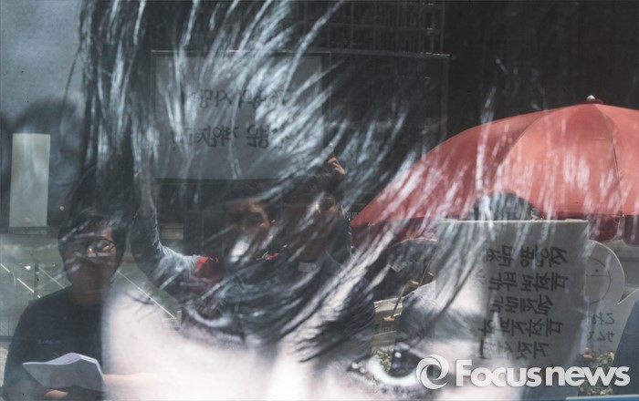 (서울=포커스뉴스) 17일 오전 서울 서초구 서초동 삼성전자 서초사옥 앞 반올림 농성장에서 반올림 관계자들이 삼성직업병 문제 올바른 해결을 촉구하는 반올림 기자회견을 하고 있다.