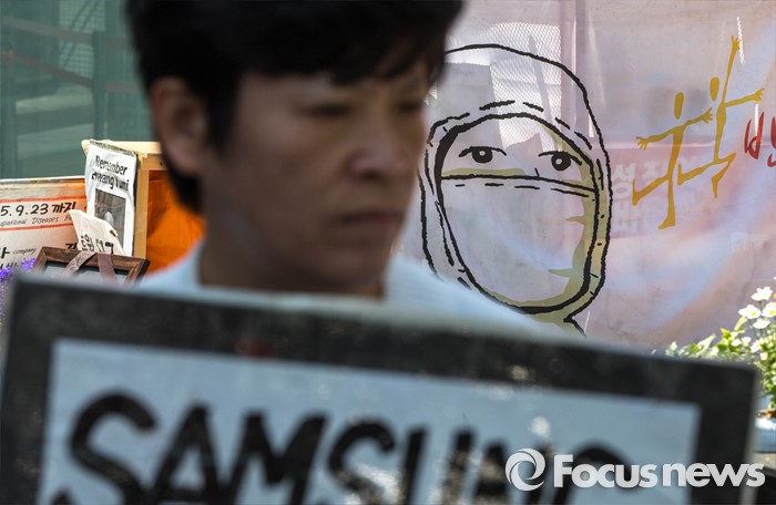 (서울=포커스뉴스) 17일 오전 서울 서초구 서초동 삼성전자 서초사옥 앞 반올림 농성장에서 반올림 관계자들이 삼성직업병 문제 올바른 해결을 촉구하는 반올림 기자회견을 하고 있다.