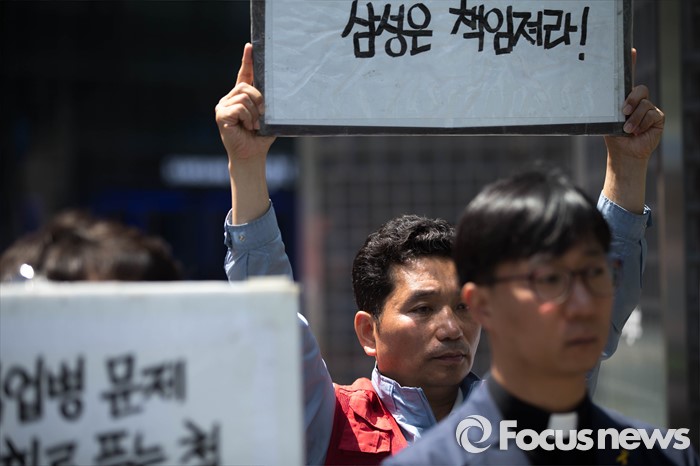 (서울=포커스뉴스) 17일 오전 서울 서초구 서초동 삼성전자 서초사옥 앞 반올림 농성장에서 반올림 관계자들이 삼성직업병 문제 올바른 해결을 촉구하는 반올림 기자회견을 하고 있다.