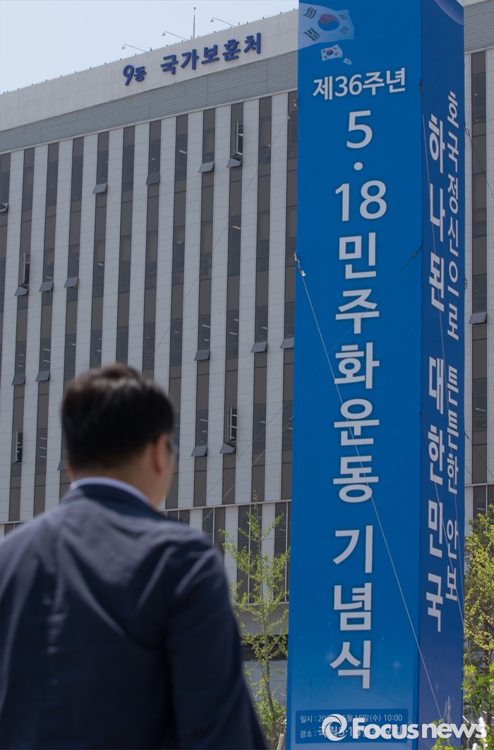 (세종=포커스뉴스) 5·18 민주화운동기념식을 하루 앞둔 17일 오전 세종시 정부세종청사 국가보훈처 앞에 기념식을 알리는 홍보탑이 설치돼 있다. 국가보훈처는 5·18 민주화운동 기념식에서 '임을 위한 행진곡' 제창을 불허결정을 내렸다.
