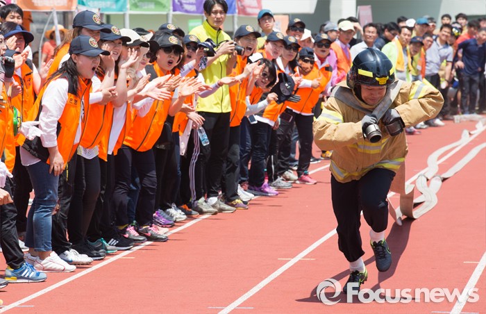 (서울=포커스뉴스) 17일 오전 서울 양천구 목동운동장에서 열린 2016 의용소방대 종합소방기술경연대회에서 참가자들이 소방호스 끌기 경기를 하고 있다.