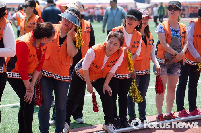 (서울=포커스뉴스) 17일 오전 서울 양천구 목동운동장에서 열린 2016 의용소방대 종합소방기술경연대회에서 참가자들이 소방호스 끌기 경기를 지켜보고 있다.