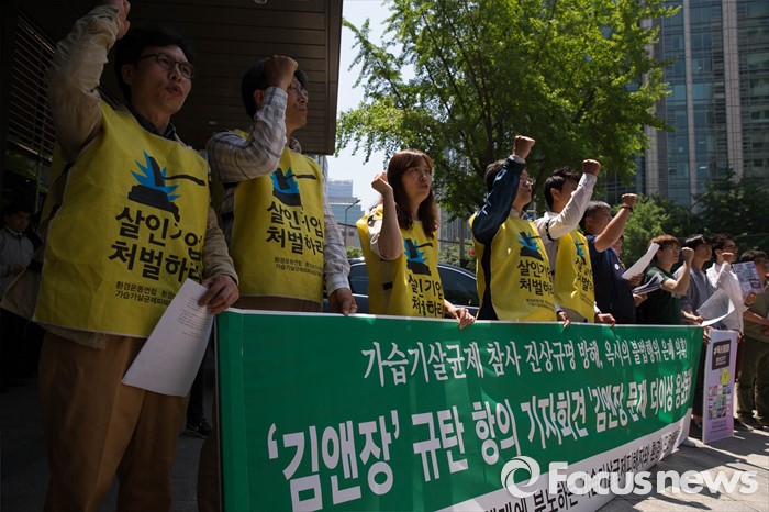 (서울=포커스뉴스) 17일 오후 서울 종로구 내자동 '김앤장' 법률사무소 앞에서 환경 및 시민단체와 가습기 살균제 피해자들이 '김앤장' 법률사무소의 옥시 불법행위 은폐 의혹을 규탄하며 기자회견을 하고 있다.