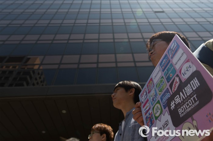 (서울=포커스뉴스) 17일 오후 서울 종로구 내자동 '김앤장' 법률사무소 앞에서 환경 및 시민단체와 가습기 살균제 피해자들이 '김앤장' 법률사무소의 옥시 불법행위 은폐 의혹을 규탄하며 기자회견을 하고 있다.