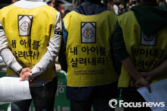 (서울=포커스뉴스) 17일 오후 서울 종로구 내자동 '김앤장' 법률사무소 앞에서 환경 및 시민단체와 가습기 살균제 피해자들이 '김앤장' 법률사무소의 옥시 불법행위 은폐 의혹을 규탄하며 기자회견을 하고 있다.