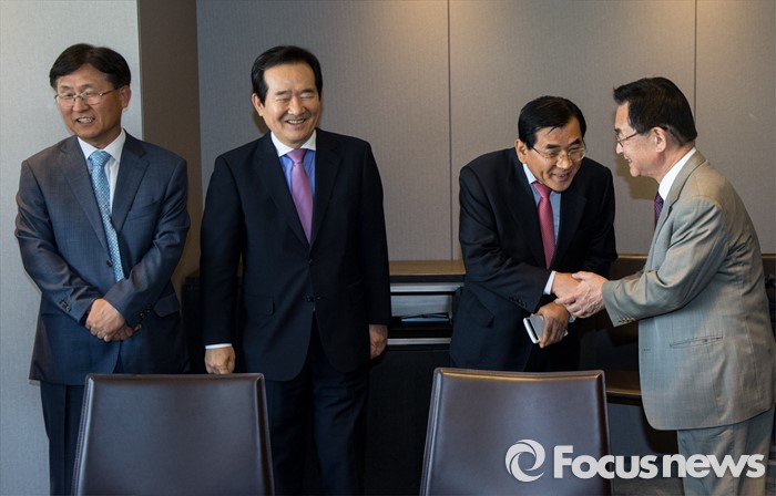 (서울=포커스뉴스) 17일 오후 서울 중구 플라자호텔에서 열린 경제사회발전 노사정위원회 역대 상임위원 간담회에 참석한 김대환(왼쪽 세번째) 위원장이 참석자들과 악수하고 있다.