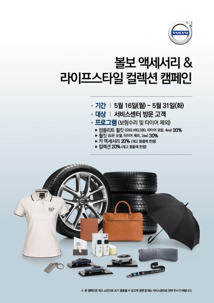 (서울=포커스뉴스) 볼보자동차코리아가 16일부터 31일까지 볼보자동차 서비스센터를 방문하는 모든 고객을 대상으로 최대 30%의 할인 혜택을 제공하는 '볼보자동차 액세서리 & 라이프스타일 컬렉션 캠페인'을 진행한다.