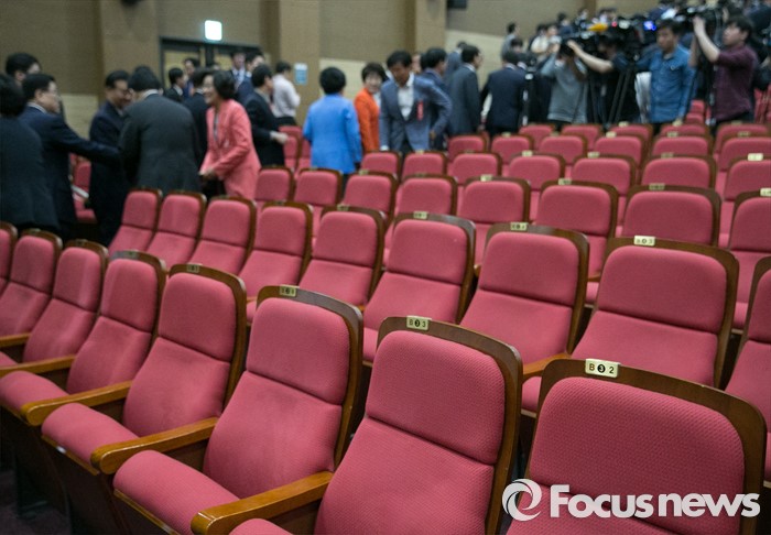 (서울=포커스뉴스) 17일 오후 서울 여의도 국회 의원회관에서 비대위 구성안 및 당헌 당규개정안 등 현안 처리를 위해 예정된 4차 새누리당 전국위원회가 무산된 후 상임고문단 등 참석자들이 퇴장해 빈 자리만 보이고 있다. 이날 전국위원회의는 앞서 예정된 상임전국위원회를 개최해 당헌개정안 등을 심의할 예정이었지만, 친박계 의원들이 대거 불참해 참석자 미달로 회의가 열리지 못 했다.