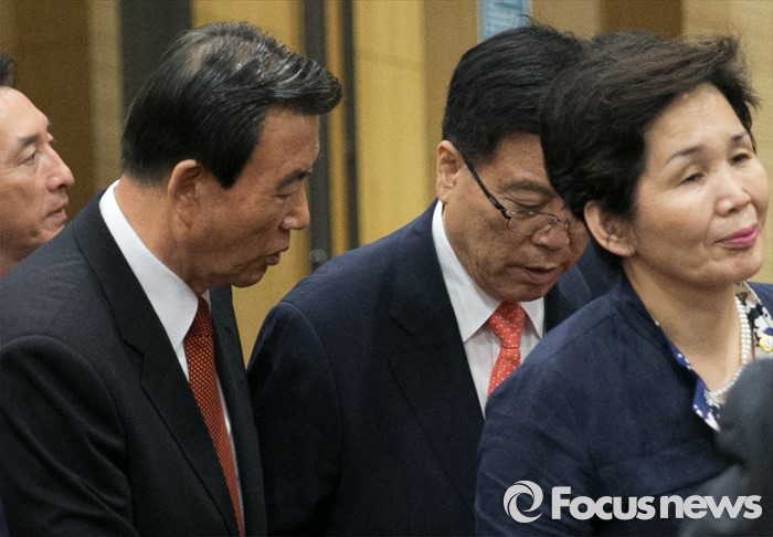 (서울=포커스뉴스) 17일 오후 서울 여의도 국회 의원회관에서 비대위 구성안 및 당헌 당규개정안 등 현안 처리를 위해 예정된 4차 새누리당 전국위원회가 무산된 후 홍문표(왼쪽 두번째) 사무총장 대행과 김광림(오른쪽 두번째) 정책위의장이 대화하며 퇴장하고 있다. 이날 전국위원회의는 앞서 예정된 상임전국위원회를 개최해 당헌개정안 등을 심의할 예정이었지만, 친박계 의원들이 대거 불참해 참석자 미달로 회의가 열리지 못 했다.