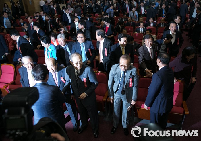 (서울=포커스뉴스) 17일 오후 서울 여의도 국회 의원회관에서 비대위 구성안 및 당헌 당규개정안 등 현안 처리를 위해 예정된 4차 새누리당 전국위원회가 무산된 후 상임고문단 등 참석자들이 퇴장하고 있다. 이날 전국위원회의는 앞서 예정된 상임전국위원회를 개최해 당헌개정안 등을 심의할 예정이었지만, 친박계 의원들이 대거 불참해 참석자 미달로 회의가 열리지 못 했다.