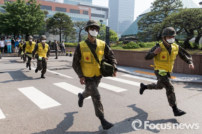 (서울=포커스뉴스) 17일 오후 서울 서초구 JW메리어트호텔 서울에서 민·관·군 관계자들이 2016 재난대응 안전한국훈련을 하고 있다.
