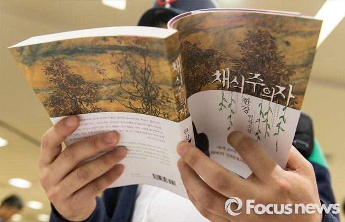(서울=포커스뉴스) 소설가 한강의 '채식주의자'가 맨부커 인터내셔널상 수상 후 판매량이 급증하고 있다. 17일 오후 서울 서초구 교보문고 강남점에서 독자들이 채식주의자를 살펴보고 있다.