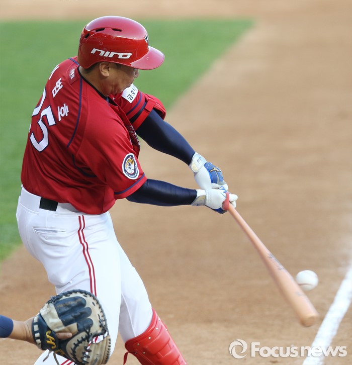 (서울=포커스뉴스) 17일 서울 잠실구장에서 열린 2016프로야구 KIA-두산 경기 2회초 선두타자로 나온 KIA 이범호가 우전 안타를 치고 있다.