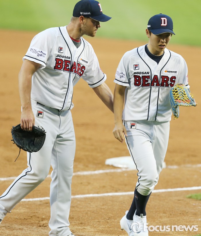 (서울=포커스뉴스) 17일 서울 잠실구장에서 열린 2016프로야구 KIA-두산 경기에서 두산 투수 보우덴이 2회초 수비를 마치고 좋은 수비를 보여준 중견수 정수빈을 맞이하고 있다.