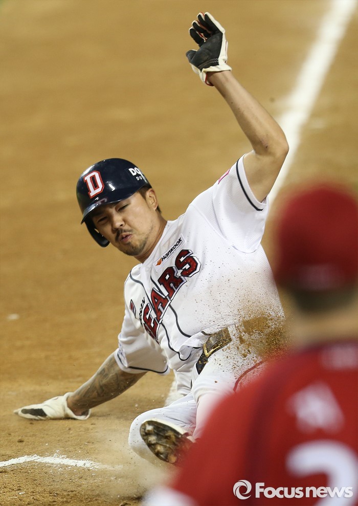 (서울=포커스뉴스) 17일 서울 잠실구장에서 열린 2016프로야구 KIA-두산 경기 5회말 1사 1,3루에서 두산 김재호의 좌익수 희샐플라이때 3루주자 오재원이 홈에서 슬라이딩하며 득점하고 있다.