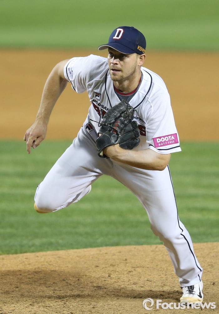 (서울=포커스뉴스) 17일 서울 잠실구장에서 열린 2016프로야구 KIA-두산 경기 7회초 무사 2루에서 두산 투수 보우덴이 KIA 강한울의 보내기 번트 타구를 잡으려 달리고 있다.