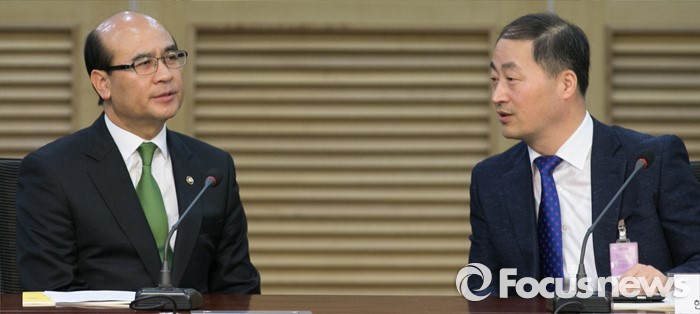 (서울=포커스뉴스) 18일 오전 서울 여의도 국회 의원회관에서 열린 가습기 살균제 사건에 대한 2차 환경독성포럼에 참석한 정연만(왼쪽) 환경부 차관과 김판기 한국환경보건학회장이 대화