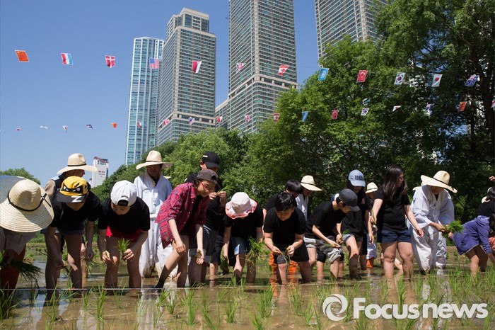 (서울=포커스뉴스) 18일 오전 서울 강남구 양재천 영동4교 인근 벼농사학습장에서 열린 전통 모내기 체험 행사에 참가한 주민들과 어린이들이 모내기를 하고 있다.