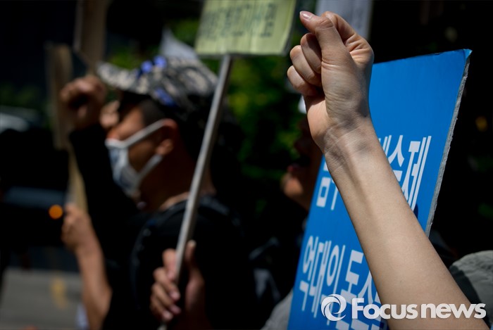 (서울=포커스뉴스) 18일 오전 서울 여의도 더불어민주당사 앞에서 사법시험 존치를 위한 고시생모임이 사시존치 법안의 법제사법위원회 전체회의 상정을 가로막은 더불어민주당 규탄시위를 하고 있다.
