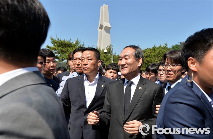 (광주=포커스뉴스) 36주년 5·18민주화운동 기념식이 거행된 18일 오전 광주 북구 운정동 5·18민주묘지에서 행사장에 참석하려는 박승춘 보훈처장이 5월 유가족의 항의를 받고 기념식장을 떠나고 있다.