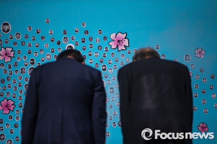 (서울=포커스뉴스) 18일 오전 서울 중구 서울시청 앞 광장에서 열린 5.18 민주화운동 기념식에 박원순 서울시장이 참석, 박석무(오른쪽) 행사위원장과 함께 헌화 후 묵념을 하고 있다.