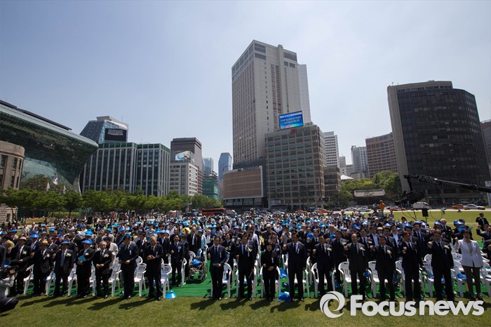 (서울=포커스뉴스) 18일 오전 서울 중구 서울시청 앞 광장에서 열린 5.18 민주화운동 기념식에서 참석자들이 임을 위한 행진곡을 제창하고 있다.