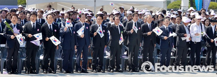 (광주=포커스뉴스) 36주년 5·18민주화운동 기념식이 거행된 18일 오전 광주 북구 운정동 5·18민주묘지에서 황교안 국무총리를 제외한 여야 지도부와 참석자들이 '임을 위한 행진곡'을 부르고 있다.