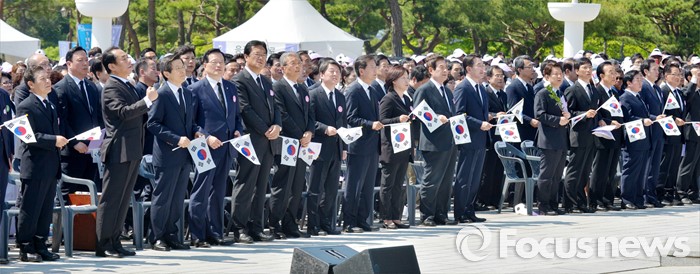 (광주=포커스뉴스) 36주년 5·18민주화운동 기념식이 거행된 18일 오전 광주 북구 운정동 5·18민주묘지에서 황교안 국무총리를 제외한 여야 지도부와 참석자들이 '임을 위한 행진곡'을 부르고 있다.