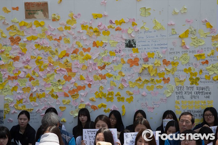 (서울=포커스뉴스) 18일 오후 서울 종로구 옛 일본대사관 앞에서 시민들이 '제1231차 일본군 위안부 문제해결을 위한 정기 수요시위'에 참석하고 있다.