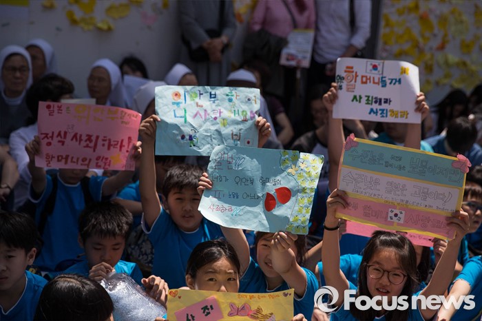 (서울=포커스뉴스) 18일 오후 서울 종로구 옛 일본대사관 앞에서 열린 '제1231차 일본군 위안부 문제해결을 위한 정기 수요시위'에 참석한 학생들이 일본의 사과를 촉구하는 손펫말을 들고 있다.