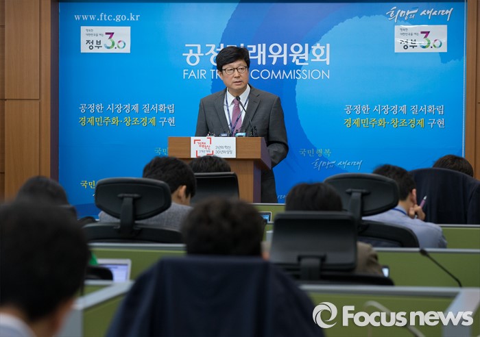 (세종=포커스뉴스) 김재신 공정거래위원회 기업거래정책국장이 18일 오전 세종시 정부세종청사 공정위 기자실에서 대형마트 3사의 대규모유통업법 위반으로 총 238억 원의 과징금을 부과했다고 밝히고 있다.