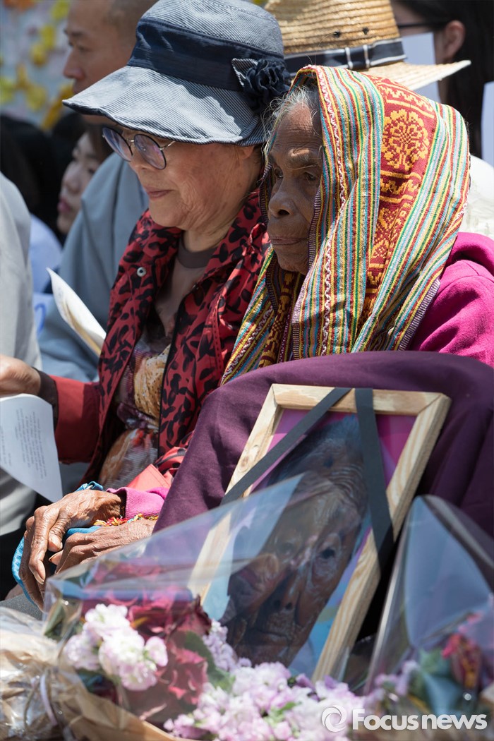 (서울=포커스뉴스) 18일 오후 서울 종로구 옛 일본대사관 앞에서 위안부 피해자 이용수(왼쪽) 할머니와 동티모르 출신 여성활동가 이네스 알메이다가 '제1231차 일본군 위안부 문제해결을 위한 정기 수요시위'에 참석하고 있다.