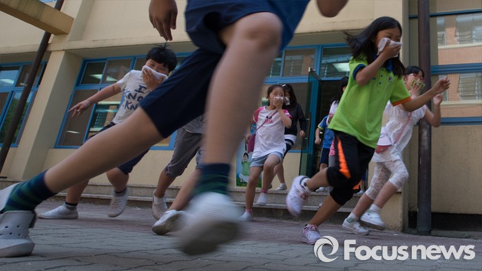 (공주=포커스뉴스) 18일 오후 충남 공주 신월초등학교에서 2016 재난대응 안전한국훈련 일환으로 실시된 현장대응 훈련에서 가스폭발로 인한 화재 발생을 가정, 학생들이 대피훈련을 하고 있다.