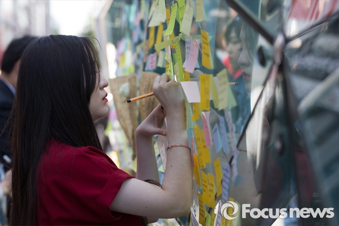 (서울=포커스뉴스) 18일 서울 서초구 강남역 10번출구에서 시민들이 '묻지마 살인' 피해자를 추모하고 있다.
