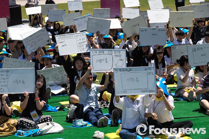 (서울=포커스뉴스) 18일 오후 서울 중구 서울시청 앞 광장에서 열린 '5.18 민주화운동 36주년 기념식 - 5.18 골든벨 행사'에 참석한 학생들이 퀴즈 문제를 풀고 있다.