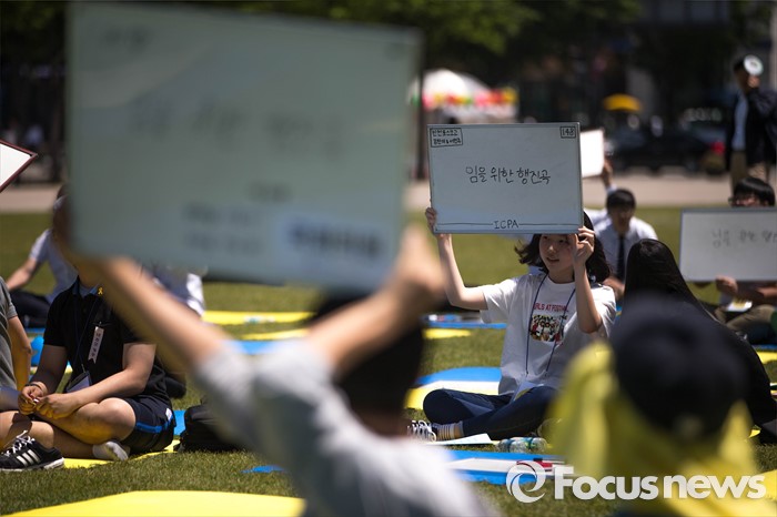(서울=포커스뉴스) 18일 오후 서울 중구 서울시청 앞 광장에서 열린 '5.18 민주화운동 36주년 기념식 - 5.18 골든벨 행사'에 참석한 학생들이 퀴즈 문제를 풀고 있다.