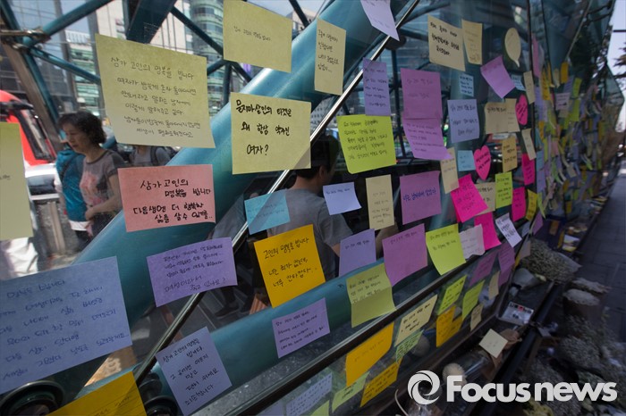 (서울=포커스뉴스) 18일 서울 서초구 강남역 10번출구에서 시민들이 '묻지마 살인' 피해자를 추모하고 있다.