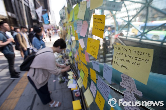 (서울=포커스뉴스) 18일 서울 서초구 강남역 10번출구에서 시민들이 '묻지마 살인' 피해자를 추모하고 있다.
