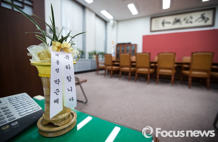 | △ 박근혜 축하의 난... '텅 빈 원내대표실' |