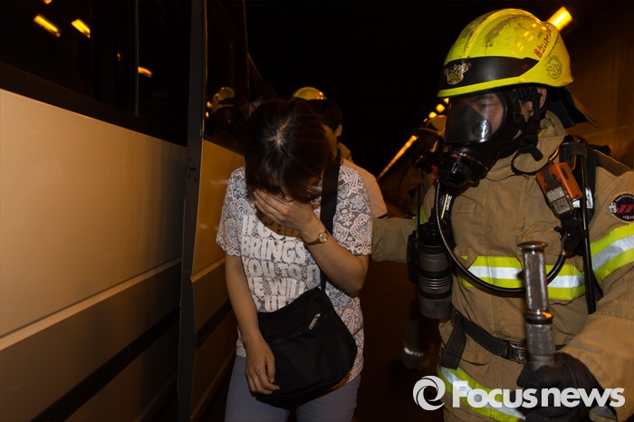(서울=포커스뉴스) 18일 오후 서울 용산구 남산2호터널에서 재난대응 안전한국훈련-터널내 화재사고 대비 훈련이 진행되고 있다.