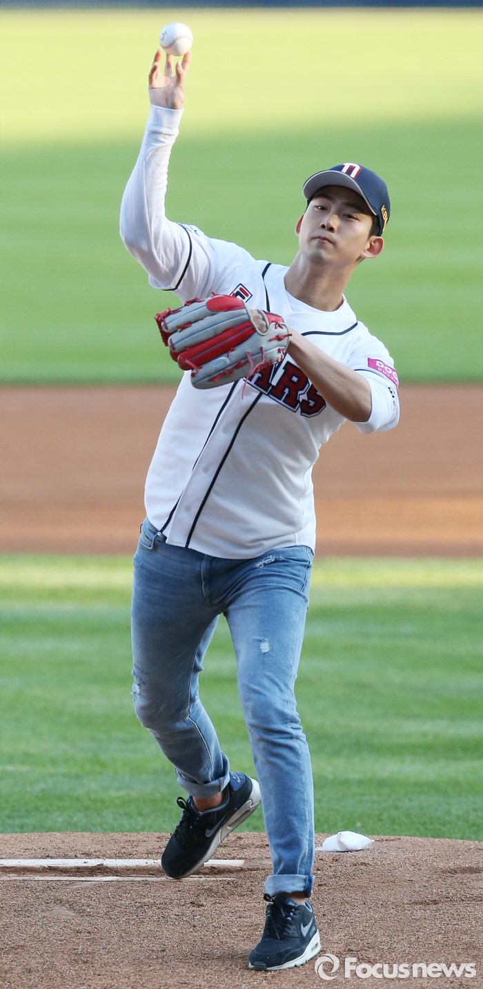 (서울=포커스뉴스) 18일 서울 잠실구장에서 열린 2016프로야구 KIA-두산 경기에 앞서 가수 겸 연기자인 옥택연이 시구하고 있다.