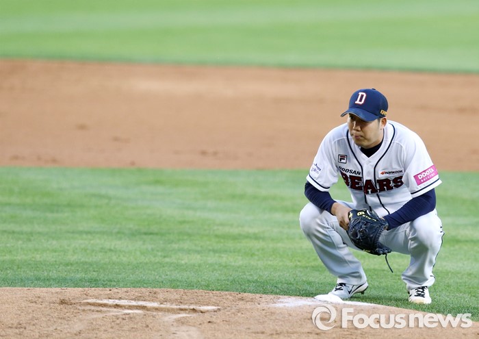 (서울=포커스뉴스) 18일 서울 잠실구장에서 열린 2016프로야구 KIA-두산 경기에서 2회초 두산 선발투수 장원준이 투구 도중 몸에 이상을 느껴 마운드 뒤에서 잠시 쪼그려 앉아 있다.