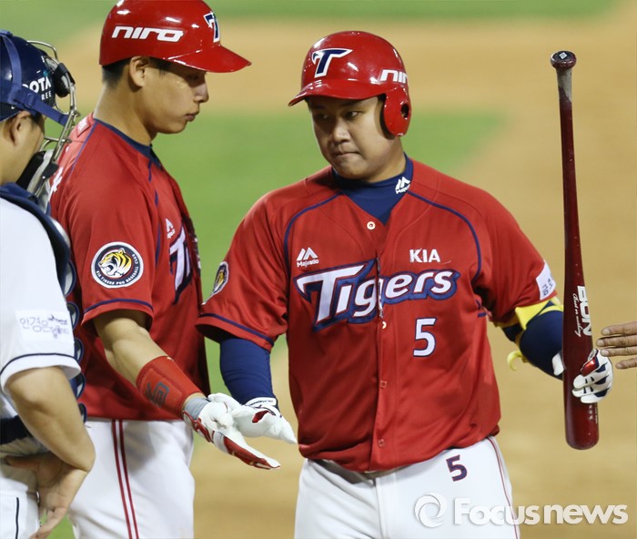 (서울=포커스뉴스) 18일 서울 잠실구장에서 열린 2016프로야구 KIA-두산 경기 5회초 KIA 황대인이 김주형에 이어 백투백으로 좌월 홈런을 치고 홈인하고 있다.