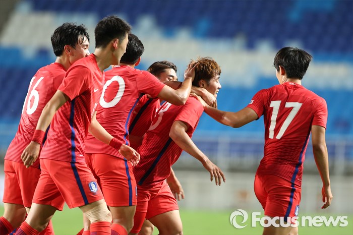 (서울=포커스뉴스) 18일 오후 경기도 수원시 수원월드컵경기장에서 열린 2016 수원 JS컵 U-19 국제청소년축구대회 대한민국과 브라질의 경기에서 한찬희가 전반전 동점골을 넣고 동료들과 환호하고 있다.