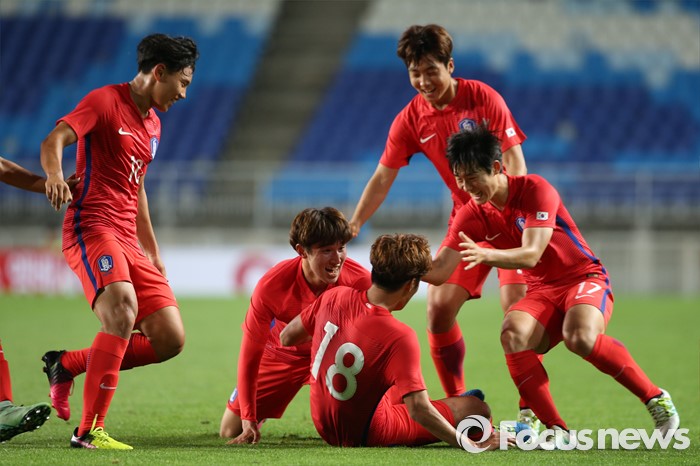 (수원=포커스뉴스) 18일 오후 경기도 수원시 수원월드컵경기장에서 열린 2016 수원 JS컵 U-19 국제청소년축구대회 대한민국과 브라질의 경기에서 한찬희가 전반전 동점골을 넣고 동료들과 환호하고 있다.