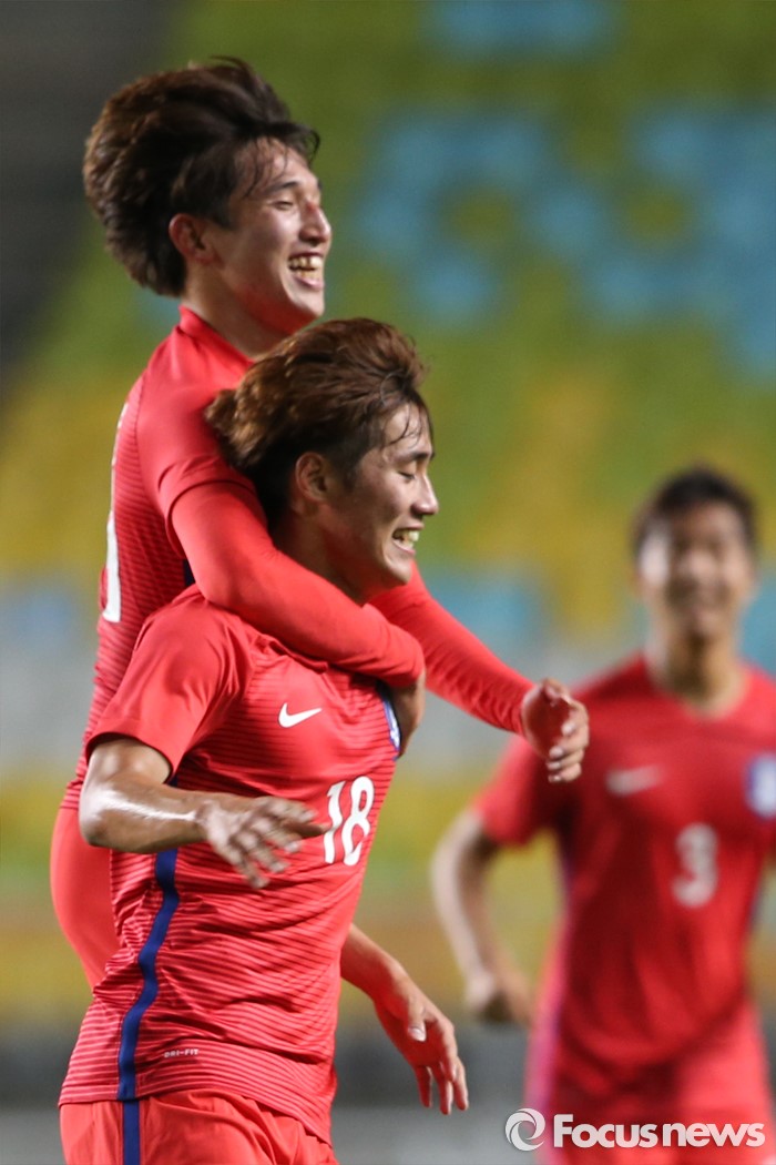 (수원=포커스뉴스) 18일 오후 경기도 수원시 수원월드컵경기장에서 열린 2016 수원 JS컵 U-19 국제청소년축구대회 대한민국과 브라질의 경기에서 한찬희(앞)가 전반전 동점골을 넣고 동료들과 환호하고 있다.