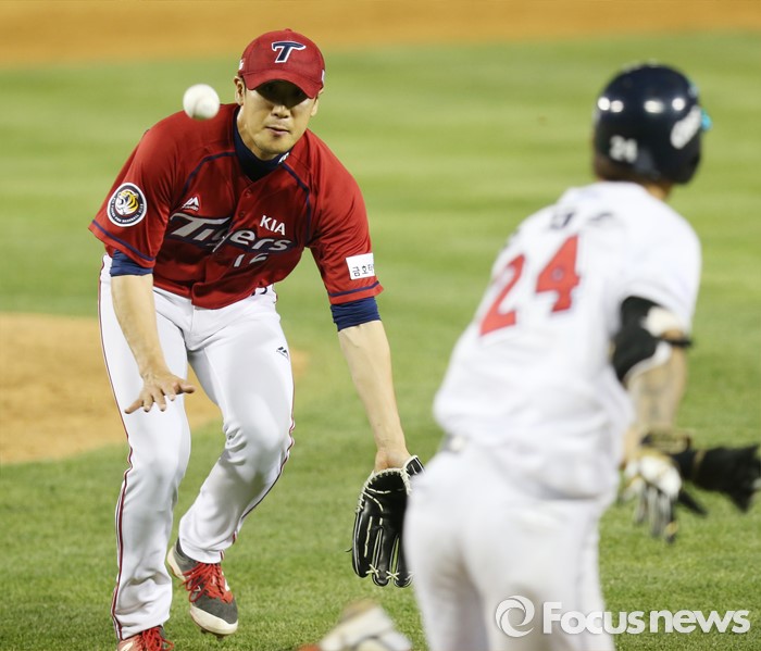 (서울=포커스뉴스) 18일 서울 잠실구장에서 열린 2016프로야구 KIA-두산 경기 8회말 2사 3루에서 두산 오재원의 내야땅볼 타구를 KIA 투수 배힘찬이 잡으러 달려 가고 있다.