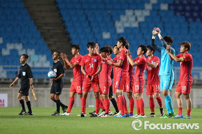 (수원=포커스뉴스) 18일 오후 경기도 수원시 수원월드컵경기장에서 열린 2016 수원 JS컵 U-19 국제청소년축구대회 대한민국과 브라질의 경기에서 한국 선수들이 경기종료 후 관중들에게 인사하고 있다.